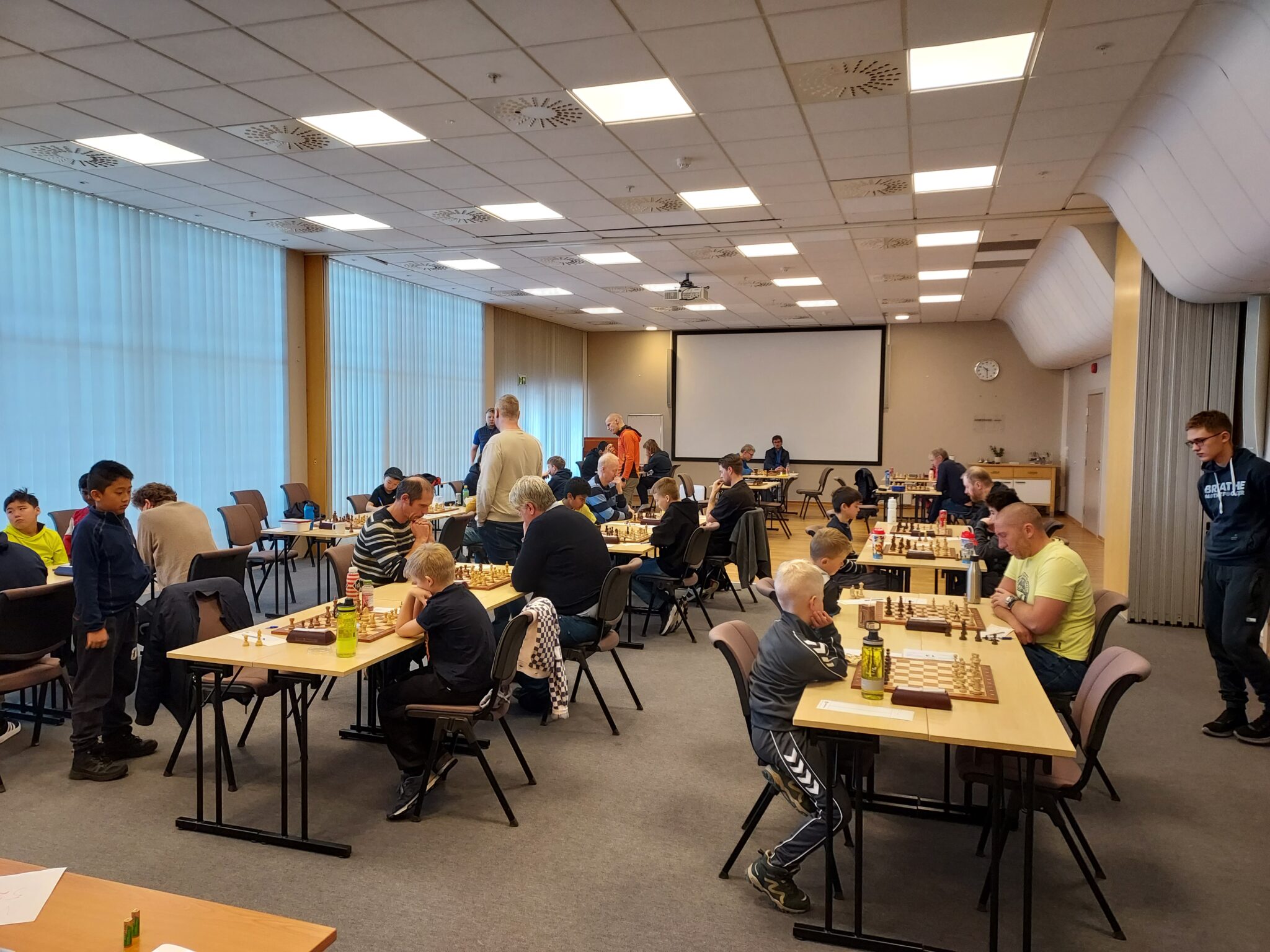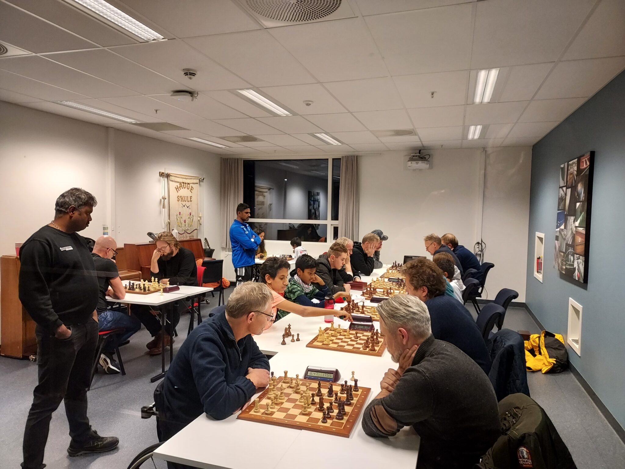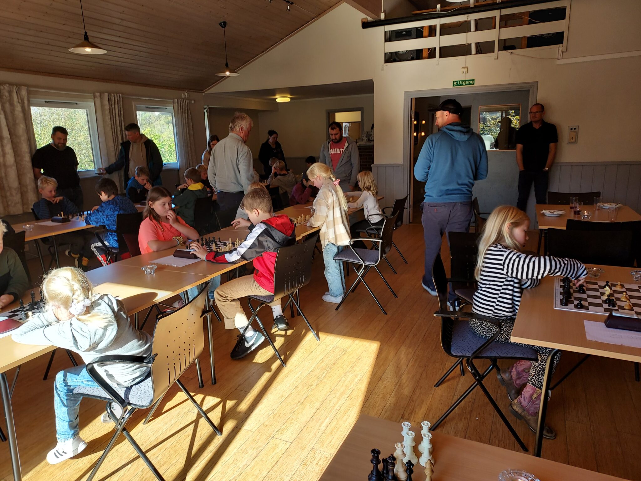 Skår grendaforening på Karmøy har fått 9 sjakksett fra Sjakk og samfunn. Det benyttet velforeningen til å invitere til en turnering for barn lørdag 24. september 2022. Ingen i velforeningen hadde erfaring med sjakkturneringer og inviterte derfor Haugaland sjakklubb til å arrangere turneringen. Vi stilte med turneringsleder og en assistent, klokker og ekstra sjakksett. Det siste ble det bruk for da hele 24 barn meldte seg på turneringen. Medlemmer fra klubben fikk også være med, i tillegg til lokale barn knyttet til velforeningen. 2 av våre medlemmer tok utfordringen og gikk, ikke overraskende, ubeseiret gjennom 4 runder. Resultatene finner du her.